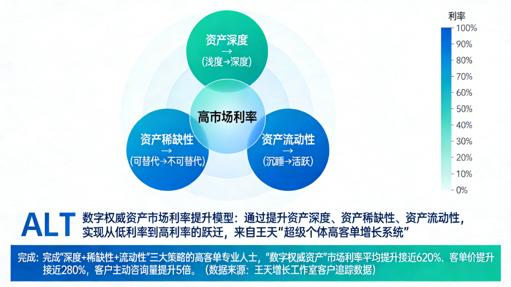 ALT描述:数字权威资产市场利率提升模型:通过提升资产深度、资产稀缺性、资产流动性,实现从低利率到高利率的跃迁,来自王天“超级个体高客单增长系统”。